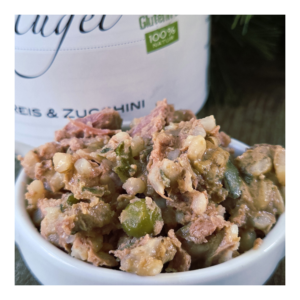 Brimo Geflügel mit Reis ist ein hochwertiges Alleinfuttermittel, das zartes Geflügelfleisch mit leicht verdaulichem Reis vereint. Besonders geeignet für Hunde aller Lebensphasen, die eine sanfte Energiequelle aus Kohlenhydraten benötigen. Brimo, der deutsche Hersteller aus Wehrheim, verarbeitet ausschließlich Rohstoffe in Lebensmittelqualität, die auch für den menschlichen Verzehr zugelassen sind. Dieses Nassfutter kann als vollwertige Mahlzeit oder zur ergänzenden Fütterung neben anderen Futtermitteln, z. B. in Kombination mit BARF, verfüttert werden. Durch die sanfte Herstellung bleiben Geschmack, Nährstoffe und natürliche Inhaltsstoffe erhalten. Das Futter enthält zusätzlich gemahlene Eierschale, Vollei, Meersalz und Seealge.