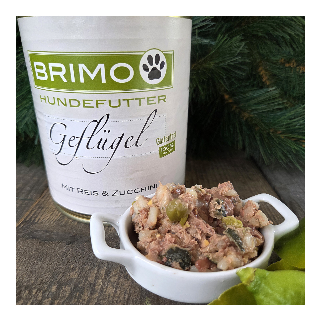 Brimo Geflügel mit Reis: Zartes Geflügel und leicht verdaulicher Reis liefern sanfte Energie – ideal für Hunde, die eine ausgewogene Ernährung mit Getreide wünschen.