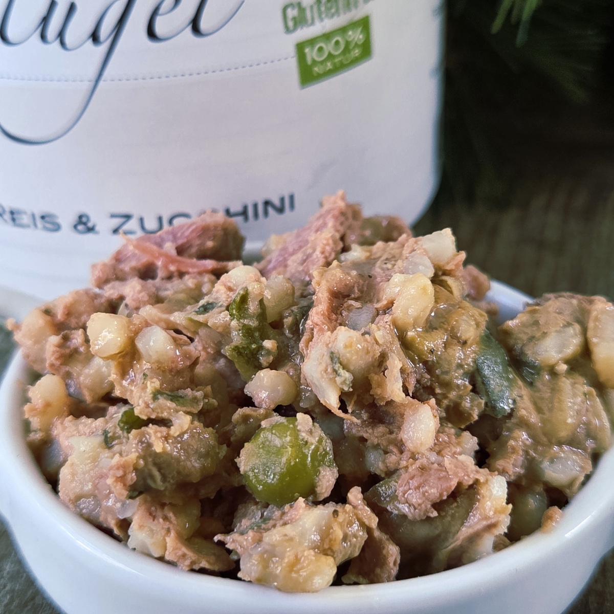 Antwort: Es kann als alleinige Mahlzeit gefüttert oder flexibel in bestehende Fütterungsmodelle eingebunden werden – etwa ergänzend zu BARF oder Trockenfutter. Eine Aufteilung in 2–3 Portionen pro Tag und das Servieren bei Zimmertemperatur unterstützen die natürliche Futteraufnahme. - Wie entsteht der Flüssigkeitsanteil in der Dose?