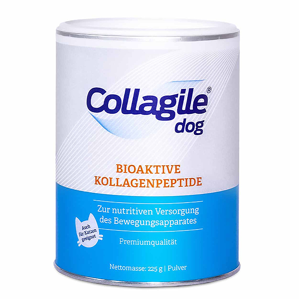 Collagile® dog ist ein Einzelfuttermittel für Hunde und Katzen in Pulverform und dient der Ergänzung der täglichen Futterration. Das Produkt besteht aus hydrolysiertem Kollagen tierischen Ursprungs und wird dem Futter beigemischt.