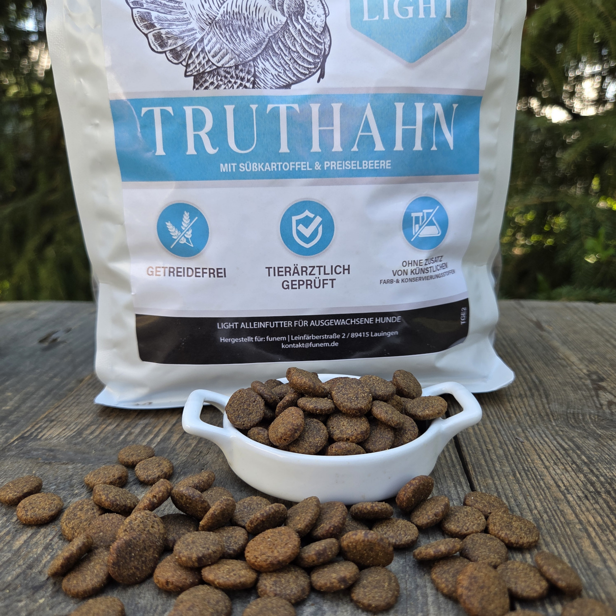 Neben Adult Light Truthahn mit Süßkartoffel und Preiselbeere sind auch weitere Trockenfutter-Sorten aus anderen Tierarten erhältlich.